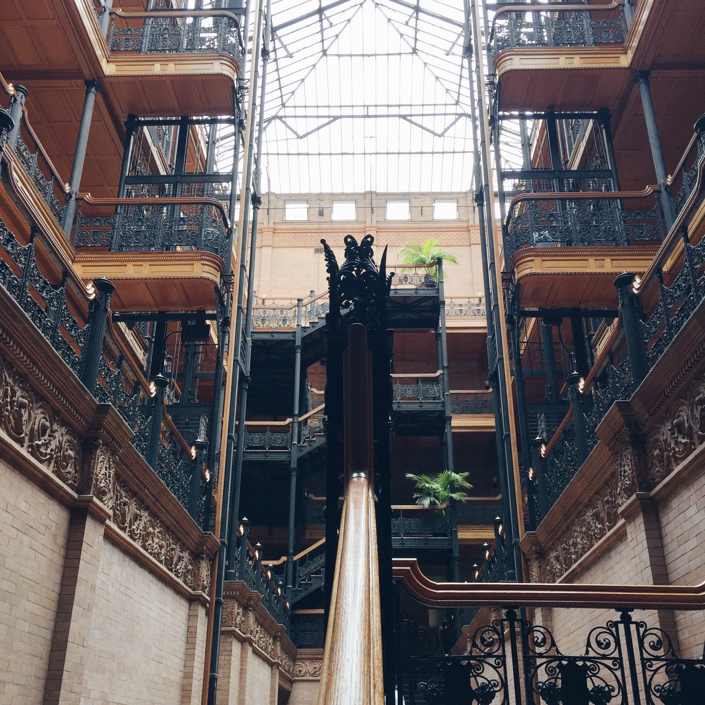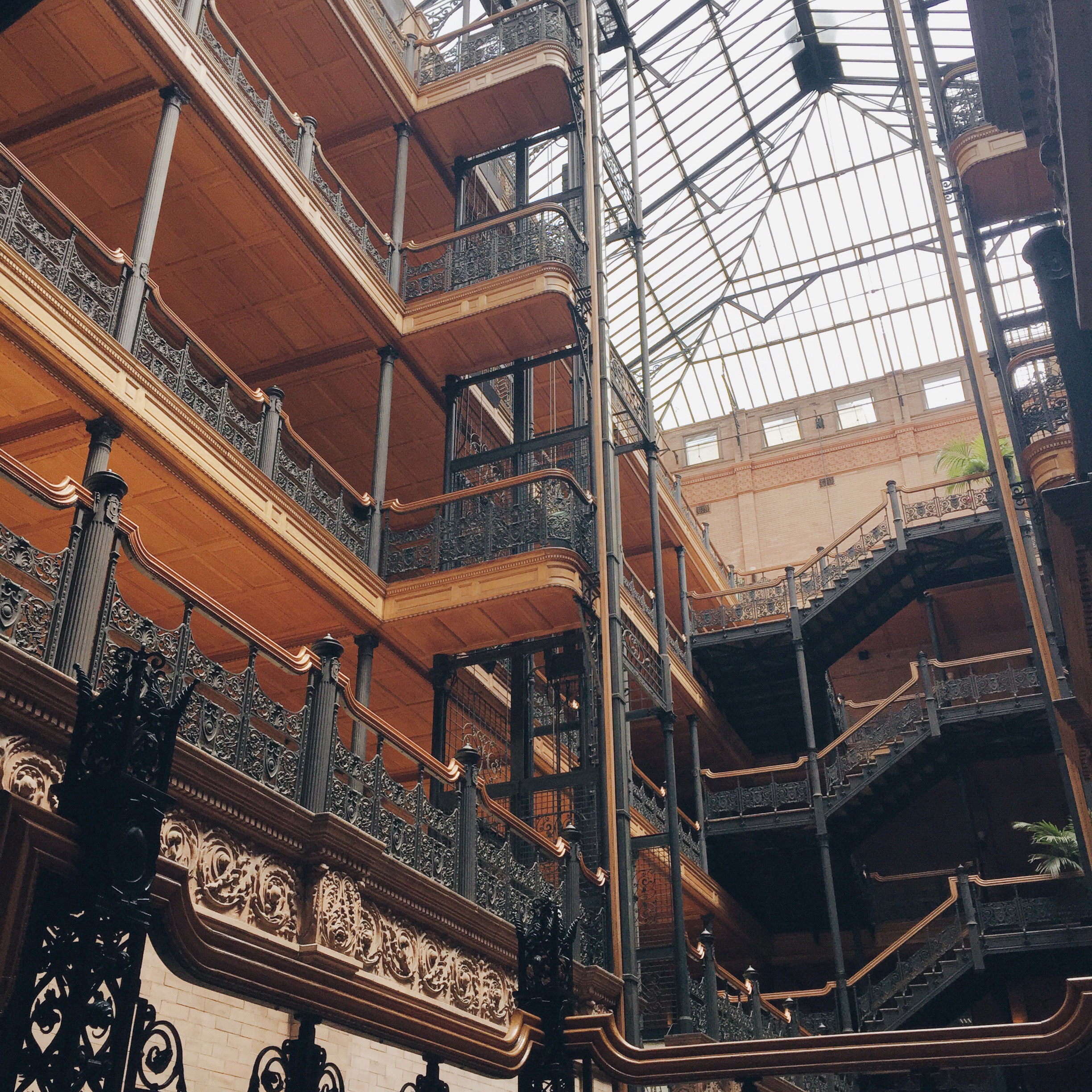 This past weekend I was able to get up close and personal with the oldest remaining commercial building in Los Angeles. The Bradbury Building is similar to an Italian Renaissance facade exposing its brown rich exterior. As I entered the doors, I was mesmerized by the eye-catching interior that forces you to look upward and appreciate the beauty of the sky light from above. The natural light allows you to see the polished wood along with its cast iron staircase and Italian marble floors giving you the feeling of a Parisian courtyard or foyer. In the film, 500 Days of Summer, Tom (Joseph Gordon-Levitt) attends a job interview inside the Bradbury Building. This scene perfectly depicts the authenticity of the building and the details of the famous cast iron staircase. The history and popularity of the Bradbury building has definitely become a tourist attraction for many & for me…it’s just another way to get closer to JGL.